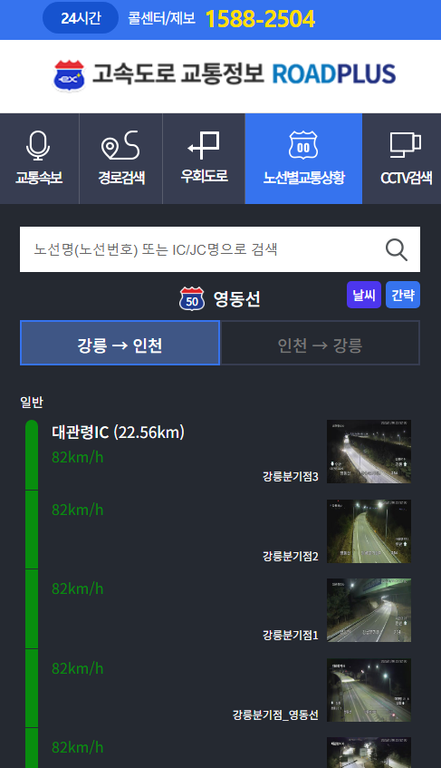 전국의 고속도로와 함께 국도의 교통상황 뿐만 아니라, 영동고속도로를 직접 눈으로 볼 수 있는 CCTV도 실시간으로 확인할 수 있습니다.