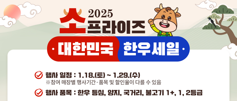 1월 18일(토)부터 1월 29일(수)까지 각종 한우 부위를 전국 대형마트와 영농조합법인, 각종 온라인몰에서 소프라이즈 2025 대한민국 한우 세일 행사로 최대 50% 할인 구매할 수 있습니다.