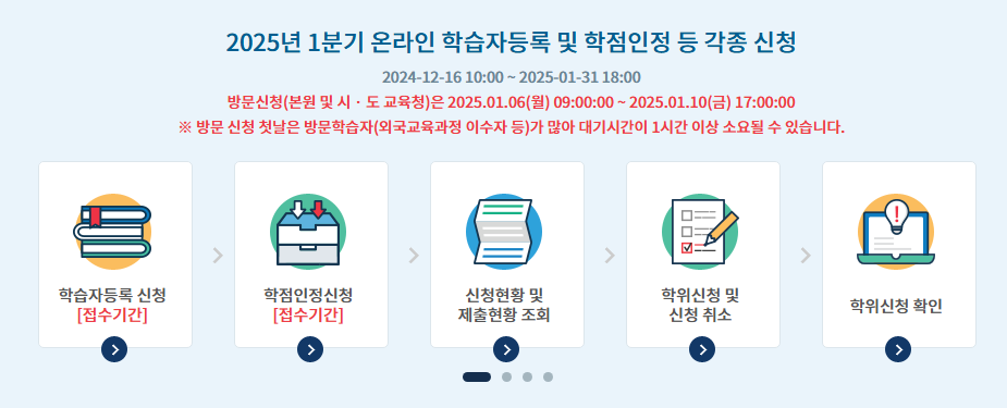 매년 1,4,7,10월에 학위과정 및 전공을 선택하여 국가평생교육진흥원 학점은행제를 통해 학습자 등록 및 신청을 진행할 수 있습니다.