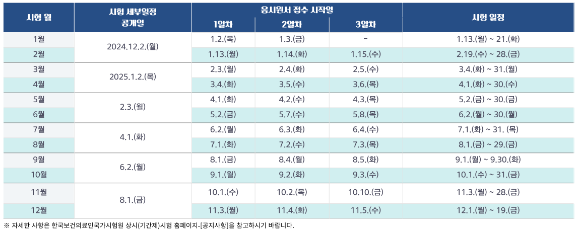 시험은 한국보건의료인국가시험원에서 주관하며, 1년에 여러 번 시행돼요. 필기시험과 실기시험으로 나뉘어 있으며, 합격 기준은 각각 60점 이상이에요.