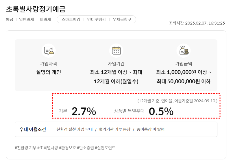 2025년 2월 7일 기준으로 조회했을 때, 최고 금리는 초록별사랑정기예금 상품이며, 12개월 거치 기준 3.2%의 최고 우대금리를 제공받을 수 있습니다.