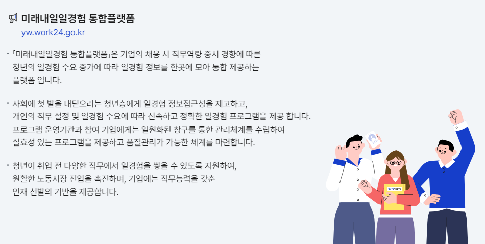 미래내일 일경험 사업은 정부 지원을 통해 청년들에게 다양한 직무 경험을 제공하는 프로그램이에요.