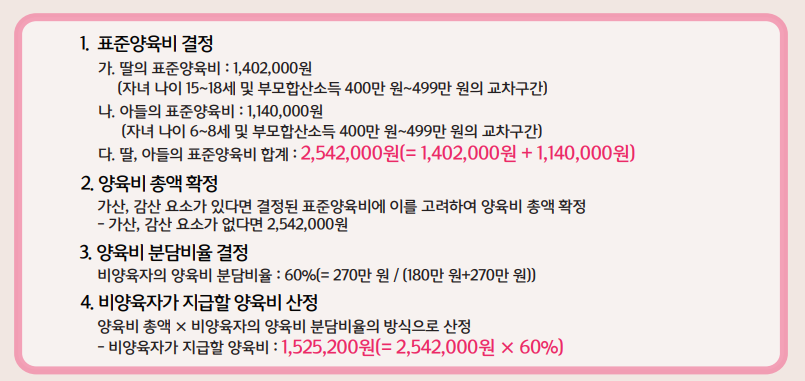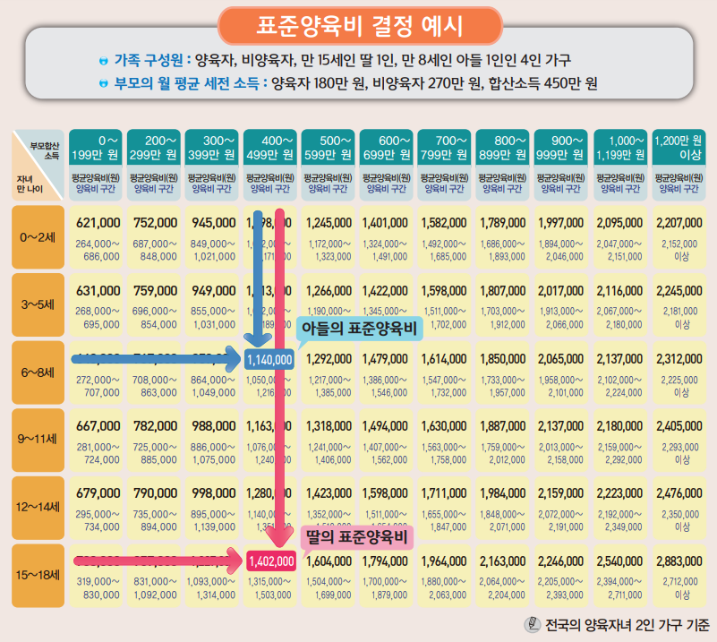 예를 들어, 부모의 월 소득이 500만 원이고, 자녀가 7세라면 해당 소득 구간에 맞는 양육비 금액이 산정표에 따라 정해지죠.