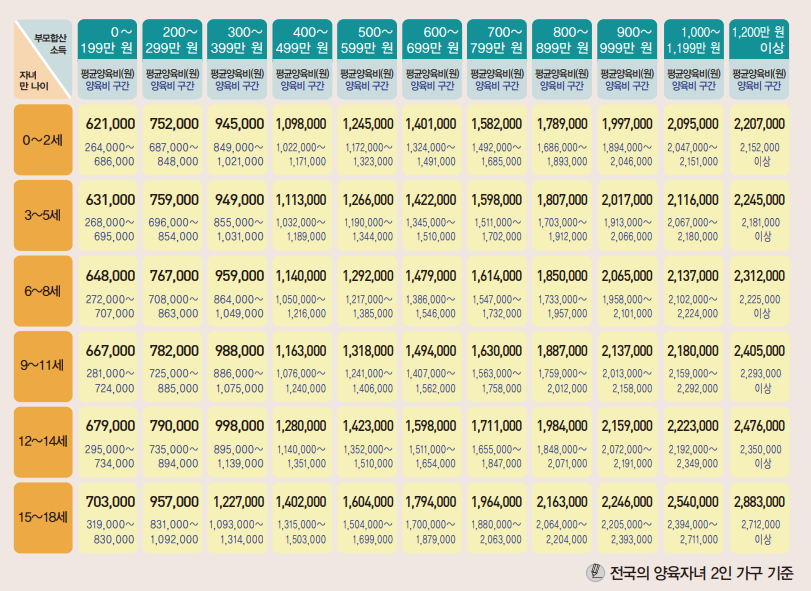 양육비는 부모의 월 소득을 기준으로 계산돼요. 법원에서 제공하는 양육비 산정표를 보면, 부모의 소득 구간과 자녀의 나이에 따라 필요한 양육비가 정해져 있어요.