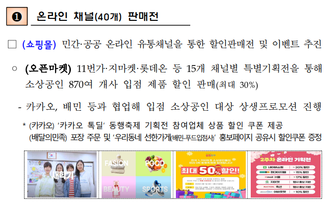 롯데마트(잠실점), 홈플러스(상동점), NC백화점(대전 유성점) 등에서 특별 기획전을 운영하며, 중소기업 및 소상공인 제품을 중심으로 최대 80%까지 할인됩니다.