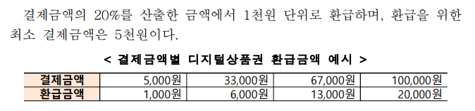 환급은 1천 원 단위로 이루어지며, 최소 5천 원 이상 결제해야 환급 대상이 됩니다. 예를 들어, 5천 원을 결제하면 1천 원을, 10만 원을 결제하면 최대 한도인 2만 원을 돌려받을 수 있어요.