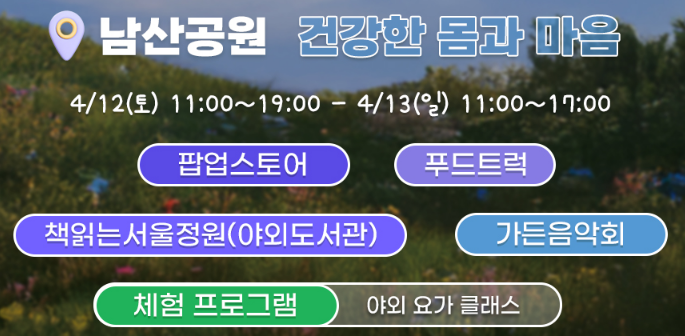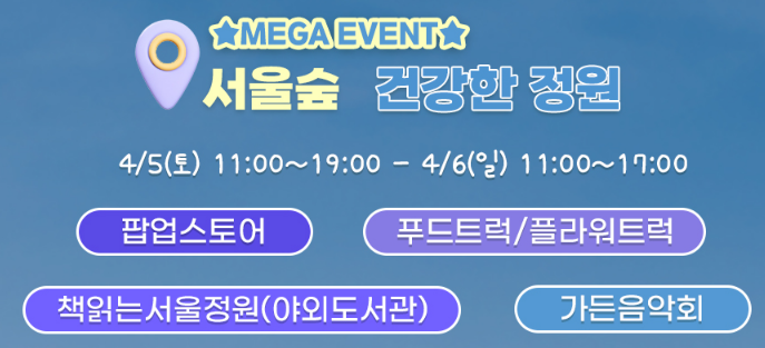 첫 행사는 4월 5일과 6일, 서울숲에서 시작되며, 이후 남산공원(4월 12~13일), 북서울꿈의숲(4월 19~20일), 선유도공원(4월 26~27일), 서울식물원(5월 4~5일) 순으로 이어져요.