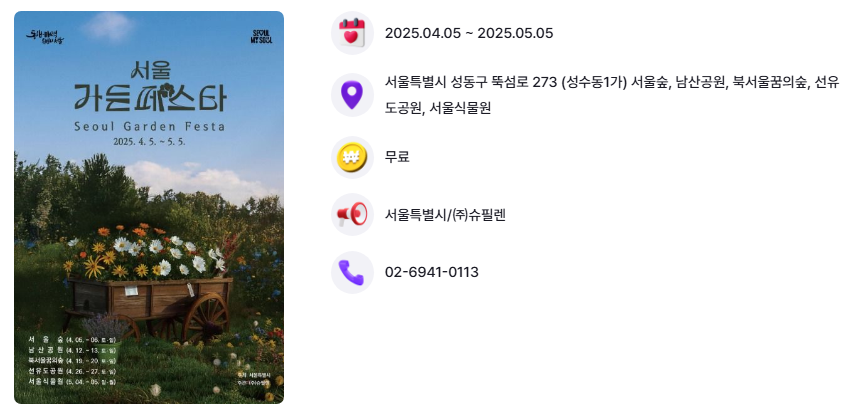 2025 서울가든페스타는 도시 속 정원을 배경으로 자연과 사람, 문화가 어우러지는 특별한 시간을 즐길 수 있답니다. 따뜻한 봄날, 가족과 연인, 친구들과 함께 서울 곳곳의 아름다운 공원에서 열리는 가든페스타를 즐기며 힐링의 시간을 가져보는 건 어떨까요?