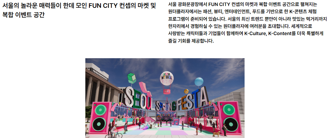 2025 서울 스프링 페스타의 핵심 공간 중 하나인 ‘원더플라자’는 단순한 플리마켓이 아니에요. 올해는 ‘FUN CITY’를 주제로 기획되어, 도심 속에 하나의 가상 도시처럼 구현된 것이 특징이에요.