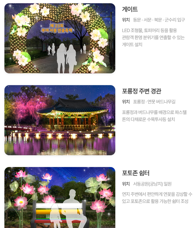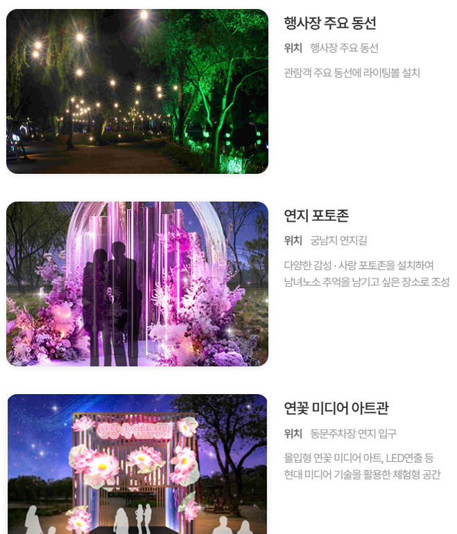 반면 야간 프로그램은 오후 7시부터 10시까지 이어지며, 음악 연주회와 조명과 함께하는 ‘연꽃 파티’가 펼쳐져요.
