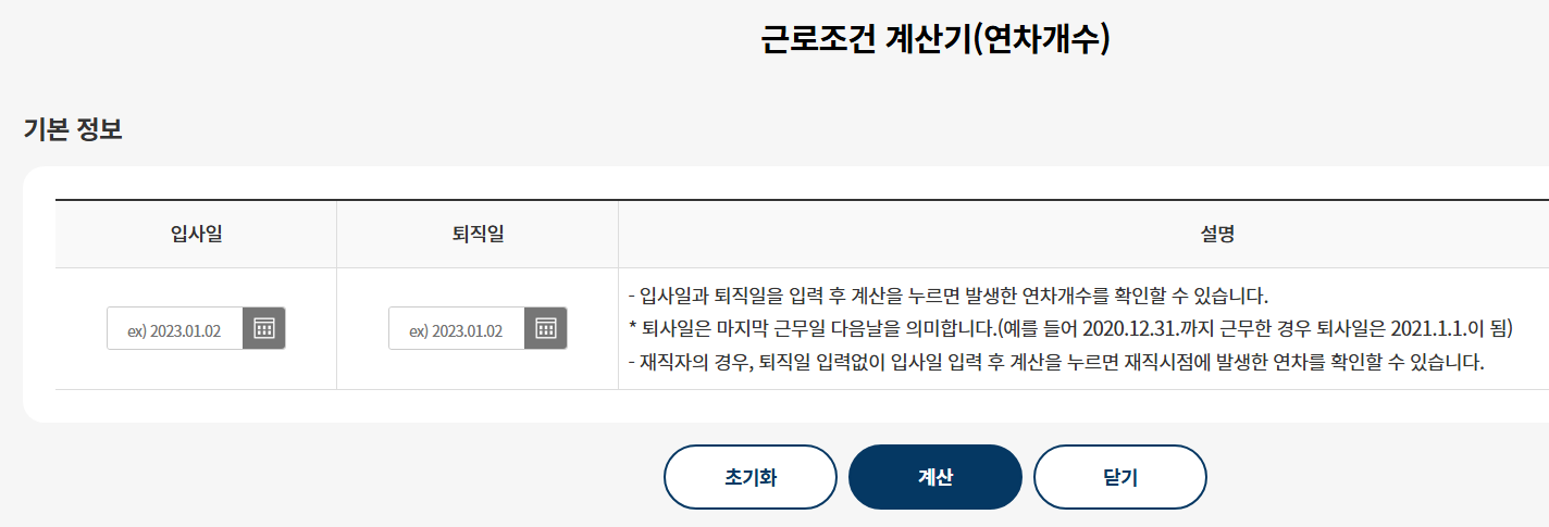 또한 연차 개수가 몇 개인지 궁금할 때는 입사일자와 마지막 근무일만 입력하면 입사일 기준 및 회계일 기준으로 연차 개수를 알 수 있는 계산기를 사용해보시면 좋습니다.