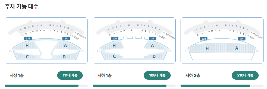 제1터미널, 제2터미널, 단기/장기 구역별로 남은 칸 수가 표시되기 때문에, 이를 참고해서 동선이나 이용 시간을 조절할 수 있습니다.